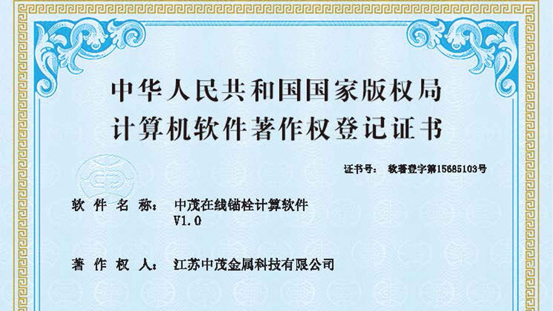 2025年,6月荣获“中茂在线锚栓计算软件”软著登记证书