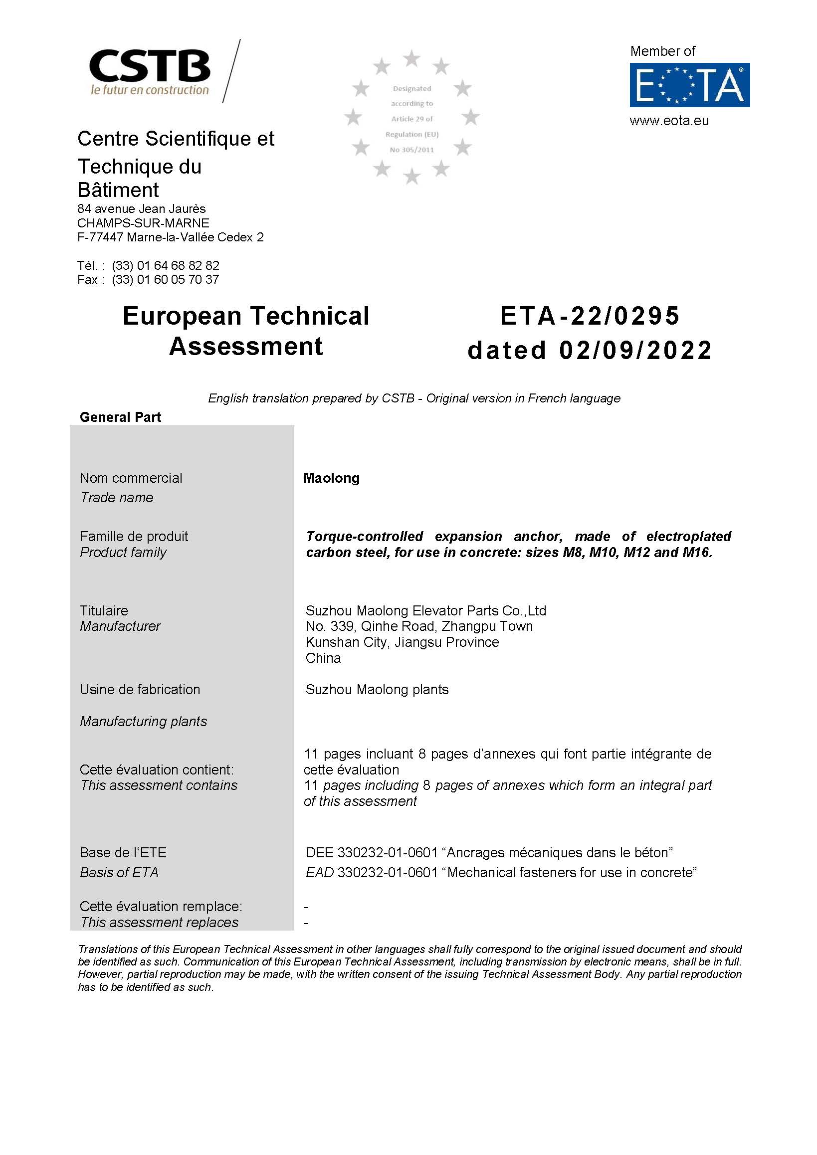 2022年,获得欧洲技术认证(ETA)
